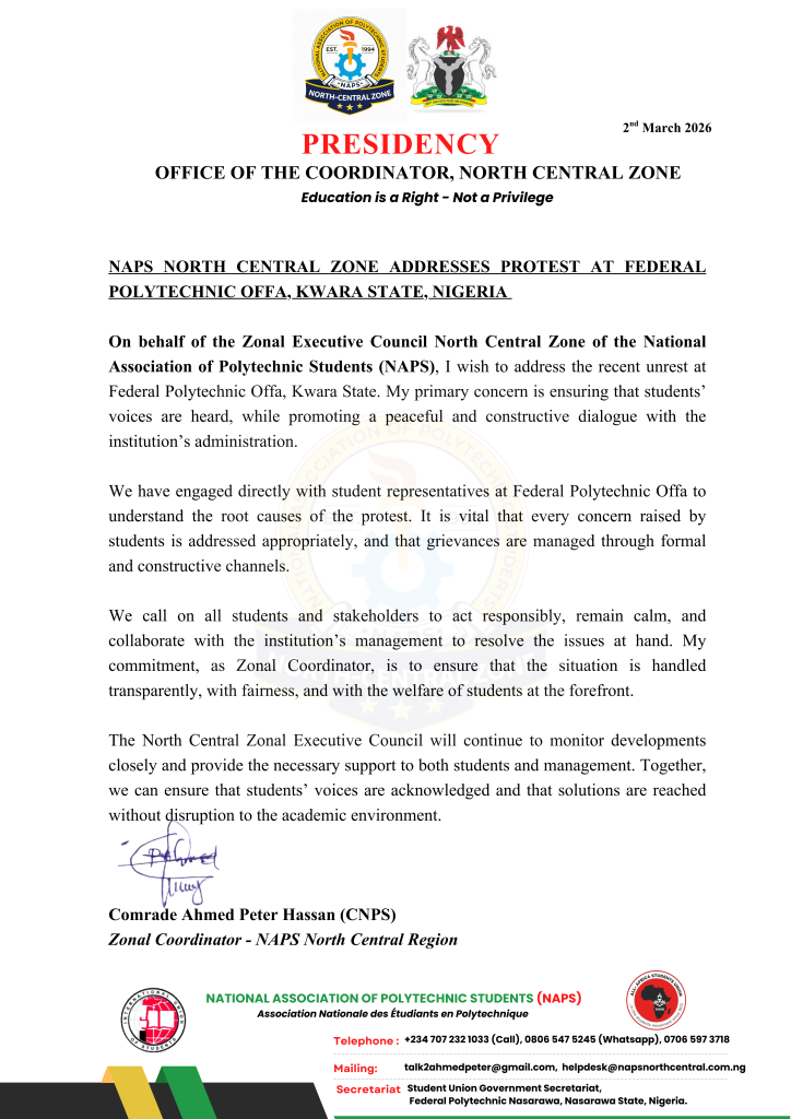 The North Central Zonal Executive Council of the National Association of Polytechnic Students (NAPS) acknowledges the recent unrest at Federal Polytechnic Offa, Kwara State. The Council remains committed to ensuring that students’ voices are heard while promoting peaceful and constructive engagement with the institution’s administration.