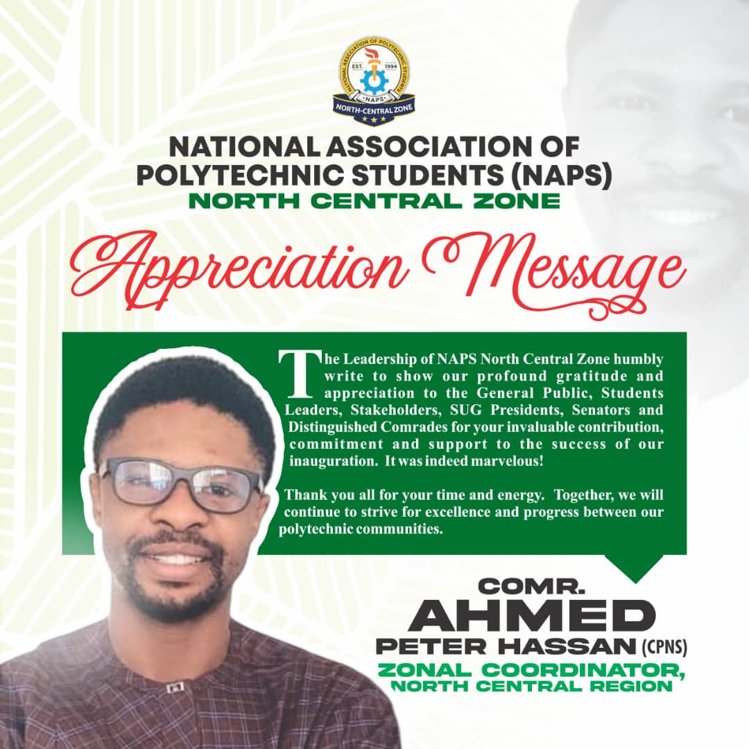The Leadership Of (NAPS) North Central Nigeria Polytechnic Students Zone C, led by the powerful Coordinator Comrade Ahmed Peter Hassan, extends heartfelt appreciations to all individuals who contributed to the successful