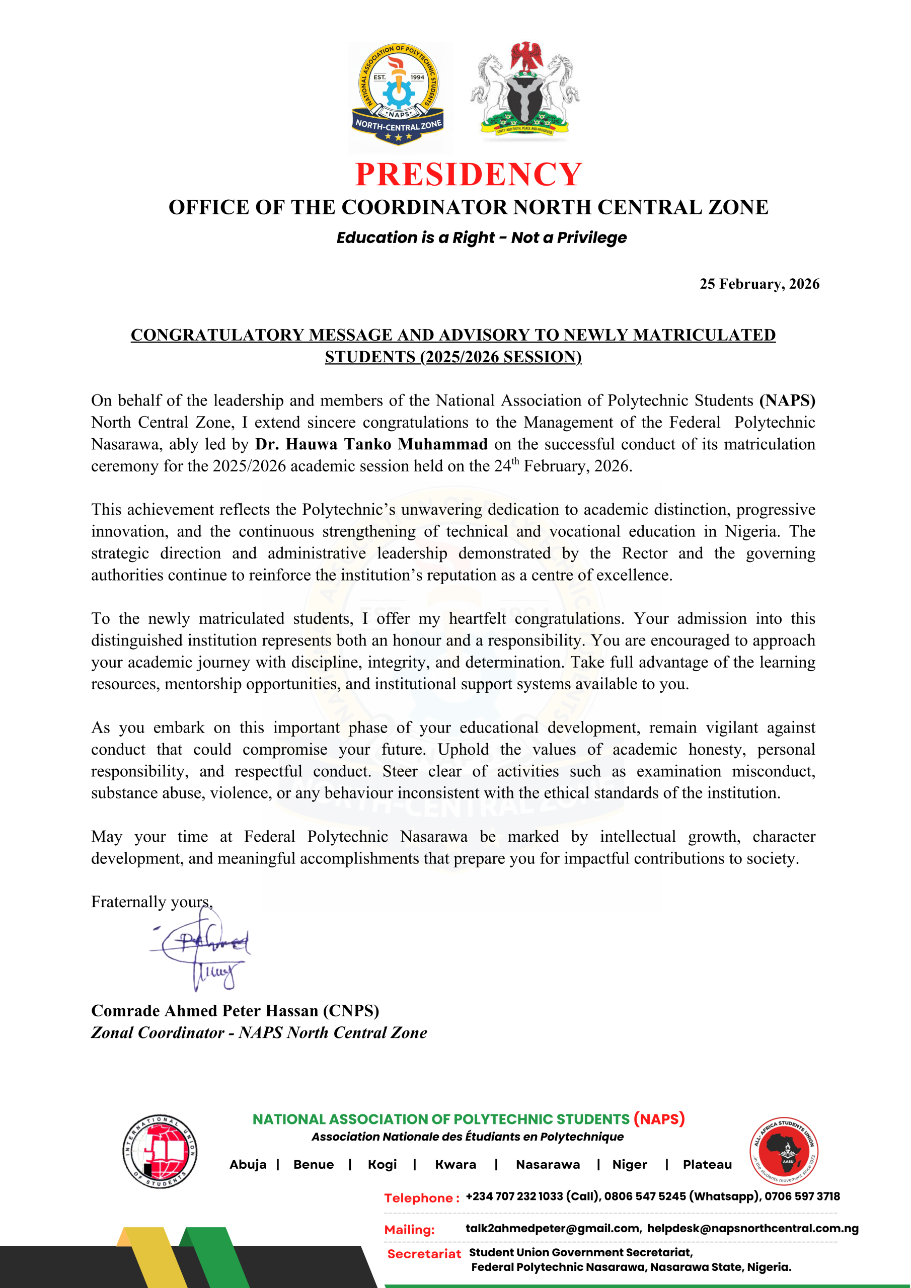 The North Central Zonal Coordinator of the National Association of Polytechnic Students (NAPS), Ahmed Peter Hassan, has formally congratulated Ukasha Ibrahim on his emergence as the newly elected President of the